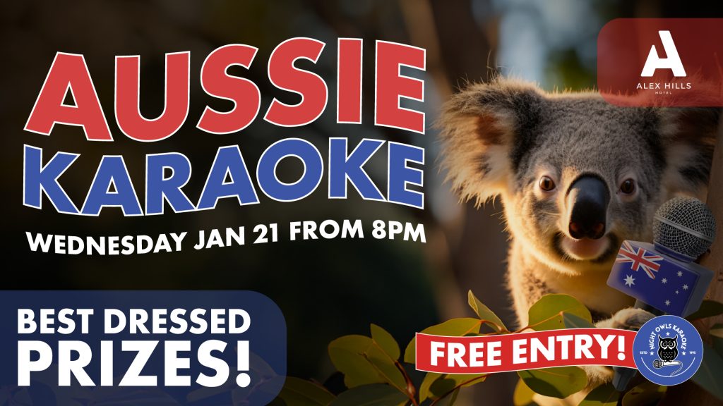 Oi oi oi! It’s time for AUSSIE KARAOKE at The Alex Hills Hotel! Dust off your vocal cords and get ready to belt out the classics! On Wednesday January 21st, we’re turning up the volume for an all-Australian karaoke showdown. Whether you’re channeling your inner Jimmy Barnes or the pop-perfection of Kylie, the stage is yours from 8PM!