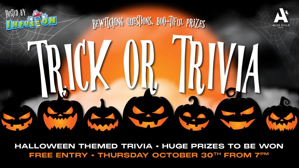 Join us at the Alexandra Hills Hotel on Thursday, October 30th at 7 PM for a night of bewitching questions and boo-tiful prizes. Hosted by the infamous Infusion Trivia, this event is sure to be a scream!